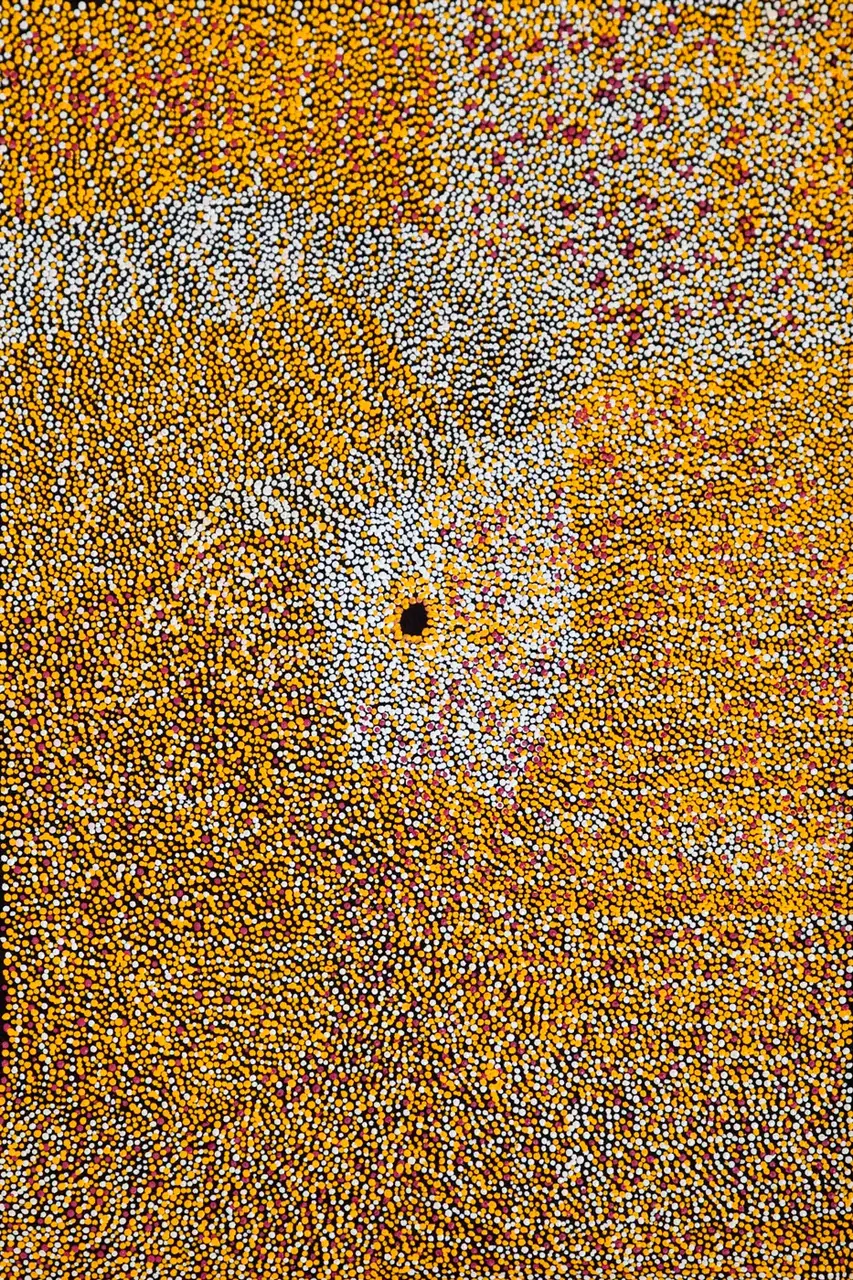 Imelda has depicted her mother’s country south of Balgo, in the Great Sandy Desert. This country here is named Winpurpurla after a tjurrnu (soakwater). Winpurpurla is an inta (living water) place so it always has good water.