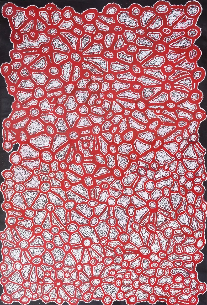 This painting is showing two areas of my country. Firstly Ukuratjara which comprises two waterholes and is an important creation site of the Seven Sister’s story. There is also depicted here the country of Mituna, an important creation site for the Boobook Owl Man. This story tells of the man who sits alone all of the time and we feel sorry for him.
