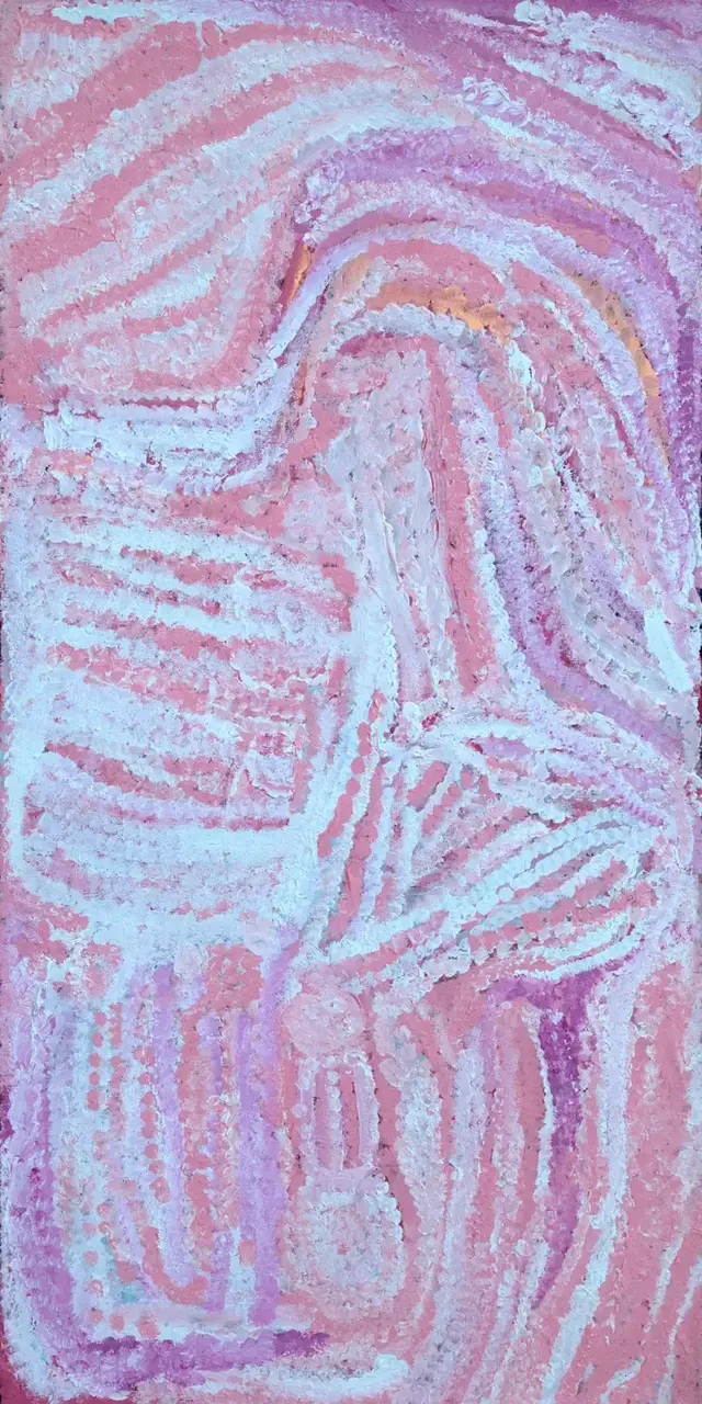 Eubena has painted some of her country south west of Balgo along the middle stretches of the Canning Stock Route. The majority of the painting shows the tali (sandhills) that dominate this country. The central circle is tjurrnu (soakwater) named Midjul. This is the country where Kinyu the spirit dog lives. Eubena would often cover Midjul with leaves so Kinyu wouldn’t come out and would also leave gifts of goanna for Kinyu.