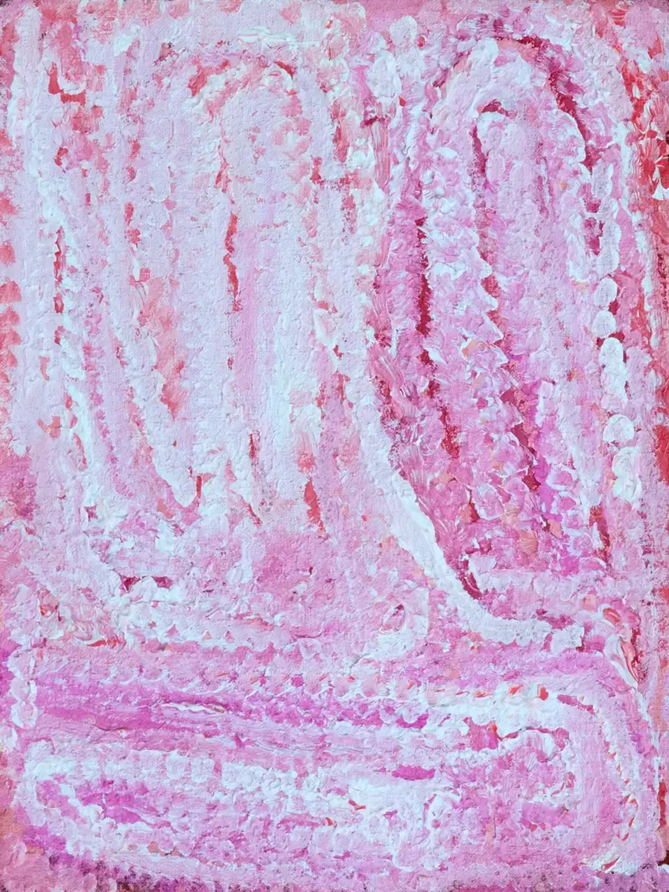 Eubena has painted some of her country south west of Balgo along the middle stretches of the Canning Stock Route. The majority of the painting shows the tali (sandhills) that dominate this country. Where there is a circular shape this is a tjurrnu (soakwater) named Midjul. This is the country where Kinyu the spirit dog lives. Eubena would often cover Midjul with leaves so Kinyu wouldn’t come out and would also leave gifts of goanna for Kinyu.