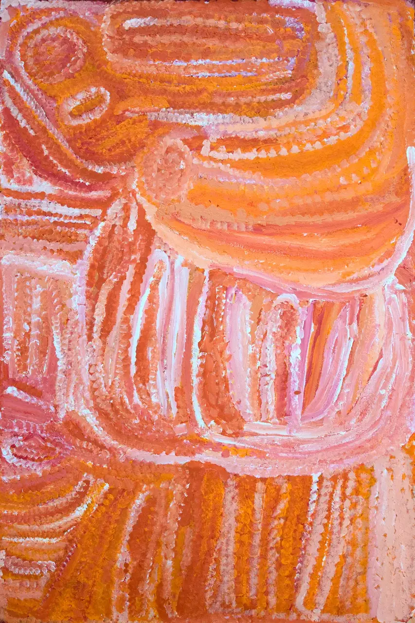Eubena has painted some of her country south west of Balgo along the middle stretches of the Canning Stock Route. The majority of the painting shows the tali (sandhills) that dominate this country. The central circles are tjurrnu (soakwater) named Midjul. This is the country where Kinyu the spirit dog lives. Eubena would often cover Midjul with leaves so Kinyu wouldn’t come out and would also leave gifts of goanna for Kinyu.