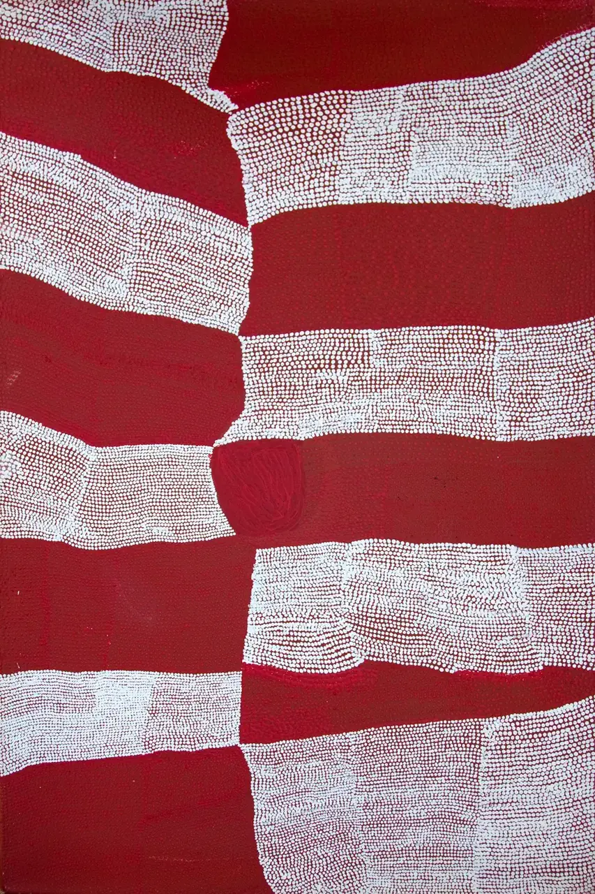 Kathleen has painted some important country for her family, which is south of Balgo in the Great Sandy Desert. The country depicted here is Nakarra Nakarra, one of the sites of the Seven Sisters Dreaming, a story about seven sisters who travel the ancestral landscape running from an old man who wants to marry the youngest. At Nakarra Nakarra a group of hills embody the seven sisters, among which is found a fjuronu, or soakwater, shown in the centre orthe painting. The hills and more distant tali, or sand dunes are shown surrounding Nakarra Nakarra.