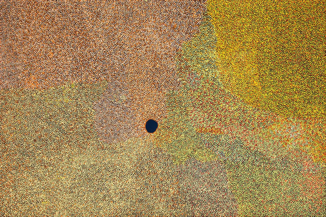 Imelda has depicted her mother’s country south of Balgo, in the Great Sandy Desert. This country here is named Winpurpurla after a tjurrnu (soakwater). Winpurpurla is an inta (living water) place so it always has good water. Women travel to Winpurpurla to collect a variety of seeds including lukarrari which is ground to make damper as well as kumpupatja (bush tomato) and karnti (bush potato). Imelda is the first child born to Lucy Yukenbarri.