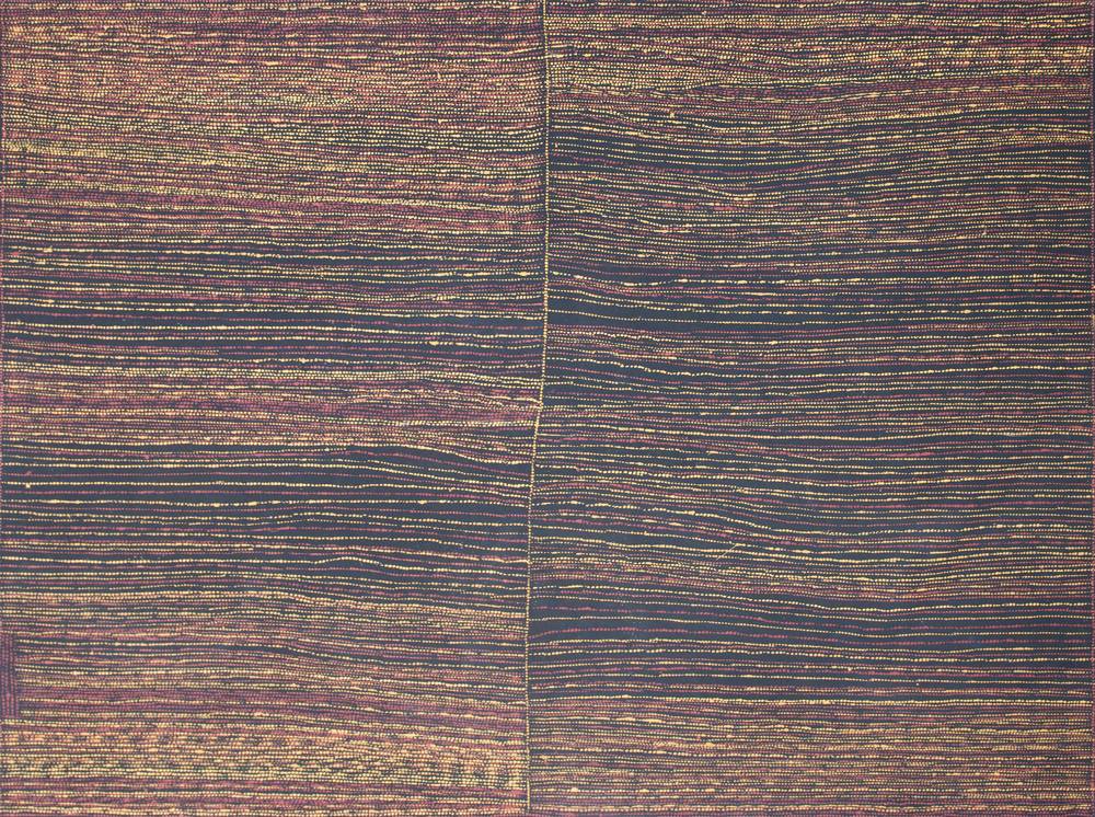 This work depicts the tidal movement of waters in and around the seas and creeks of the Tiwi Islands. Not just influencing fishing and hunting opportunities, the movement of water carries masses of silt and sand, transforming the land and changing the coastal landscape. Winga can also be translated as ’waves’, just one part of the changing tides. Tidal surges are at their most powerful when a king tide occurs during the Wet Season, especially during a full moon.  Cornelia has a strong bond to the waters surrounding the Tiwi Islands, forged by a lifetime of memories living encircled within the tides of the Arafura Sea.