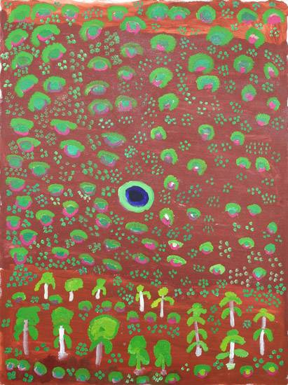 The picture depicts a jumu (soakwater) with trees and bush tucker all around.