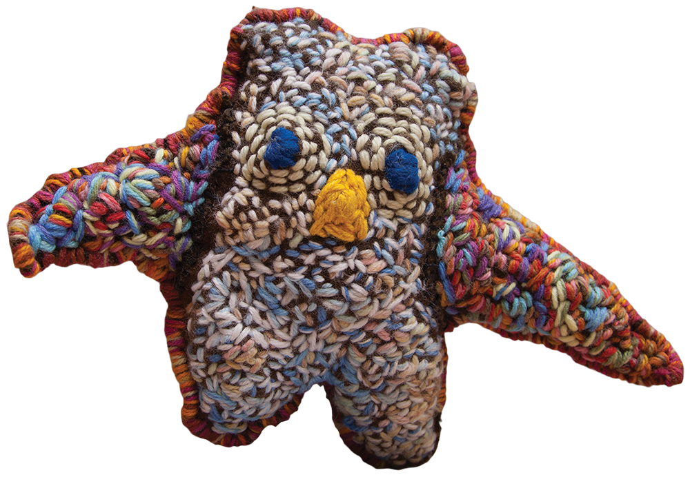 Marlene has sewn many owl heads using recycled blankets. If you look closely at the faces, they all make a different face and each one tells its own story.