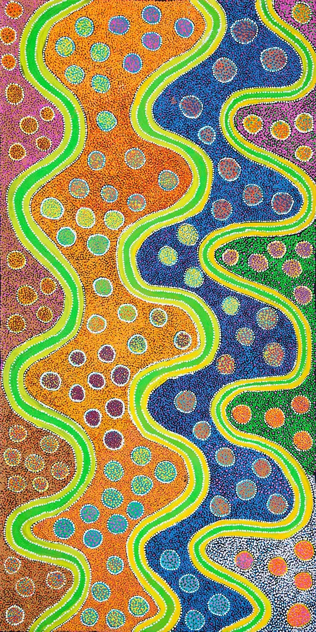 In this painting, she has depicted her mother’s country, Nynmi, on the Canning Stock Route in the Great Sandy Desert. The country is centred around Minyilpa warniri (rockhole) and the central circle indicates Minyilpa. Ann’s mother would walk between these places collecting seeds and hunting for bush tucker.