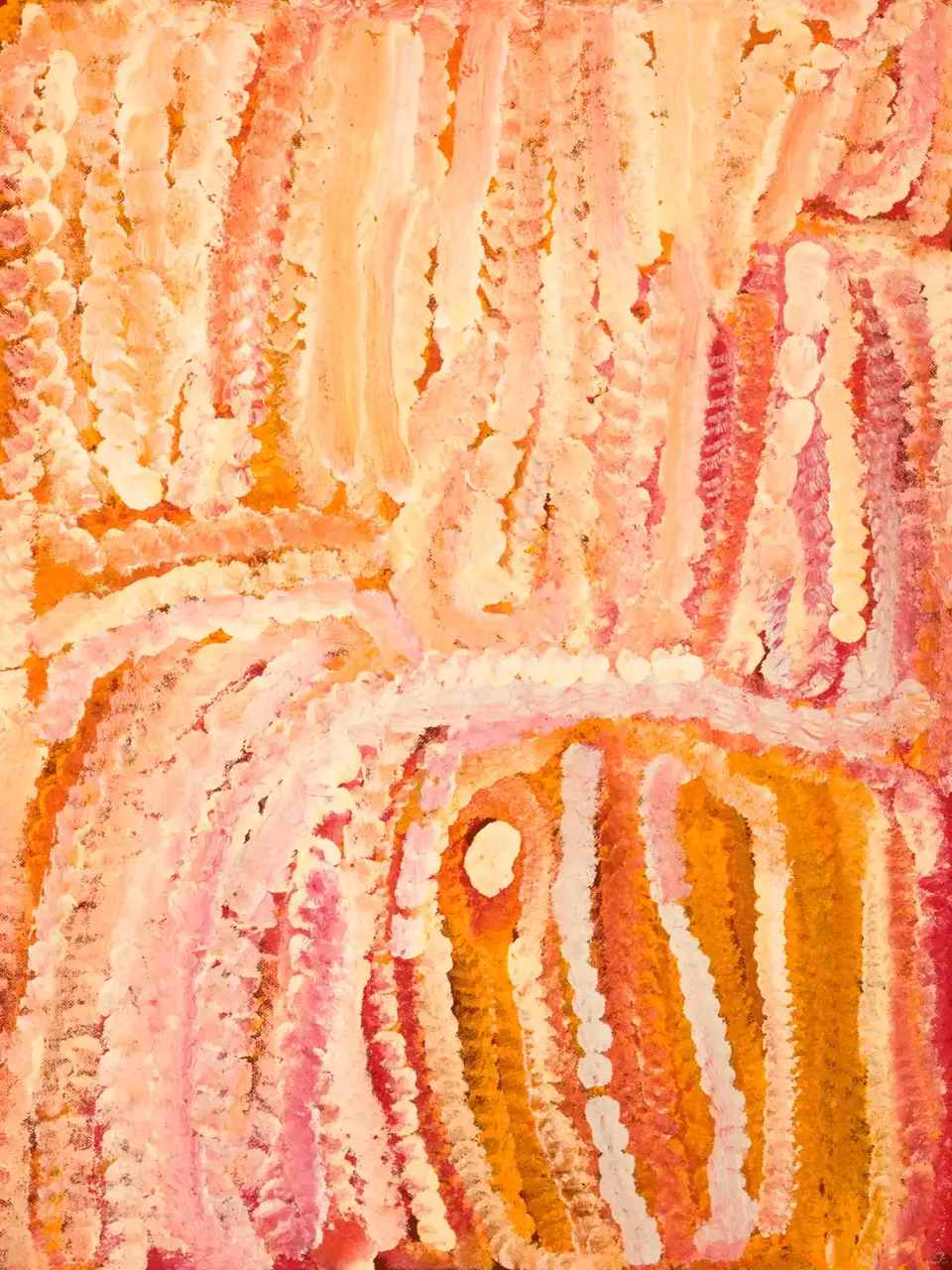Eubena has painted some of her country south west of Balgo along the middle stretches of the Canning Stock Route. The majority of the painting shows the tali (sandhills) that dominate this country. The central circle is Tjurrnu (soakwater) named Midjul. This is the country where Kinyu the spirit dog lives. Eubena would often cover Midjul with leaves so Kinyu wouldn’t come out and would also leave gifts of goanna for Kinyu.