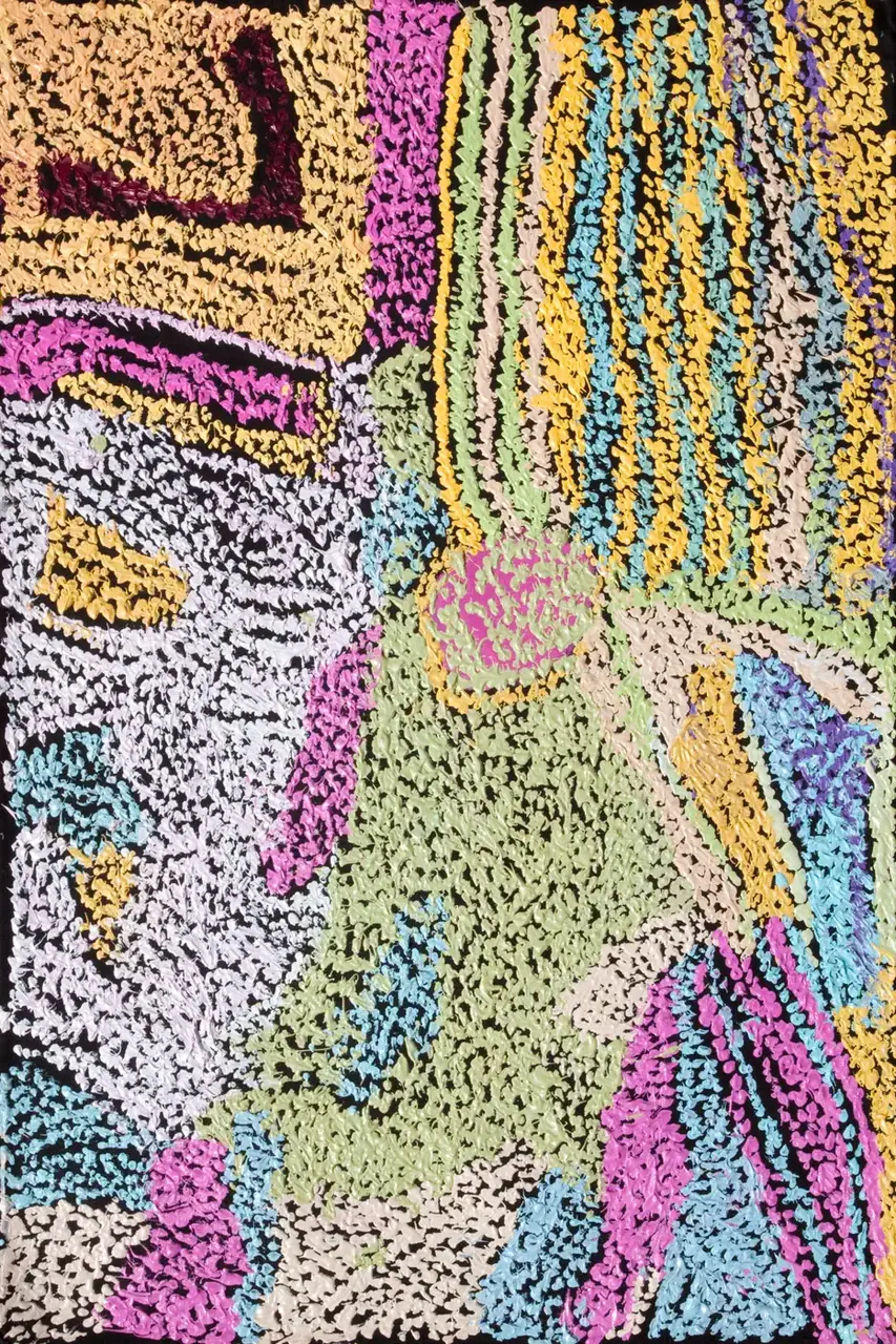 This painting depicts the country known as Parwalla, which is Nyumi’s father’s country. This country is far to the south of Balgo in the Great Sandy Desert, west of Kiwirrkurra, and is dominated by tali (sand hills). Parwalla is a large swampy area, which fills with water after the wet season rain and consequently produces an abundance of bush foods. The majority of Nyumi’s painting shows the different bush foods, including kantjilyi (bush raisin), pura (bush tomato) and minyili (seed). Women, shown as the U shapes, with their wana (digging sticks) and coolamons gathering the foods are also depicted. The whitish colours, which dominate the painting, represent the spinifex that grows strong and seeds after the wet season rains. These seeds are white in colour, and grow so thickly they obscure the ground and other plants below.