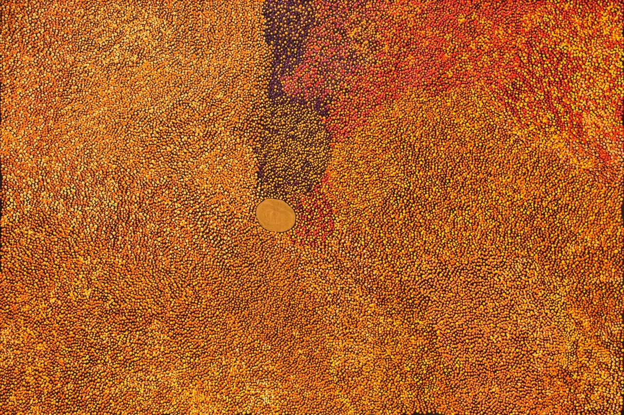 Imelda has depicted her mother’s country south of Balgo, in the Great Sandy Desert. This country here is named Winpurpurla after a tjurrnu (soakwater). Winpurpurla is an inta (living water) place so it always has good water. Women travel to Winpurpurla to collect a variety of seeds including lukarrari which is ground to make damper as well as kumpupatja (bush tomato) and karnti (bush potato). Imelda is the first child born to Lucy Yukenbarri.