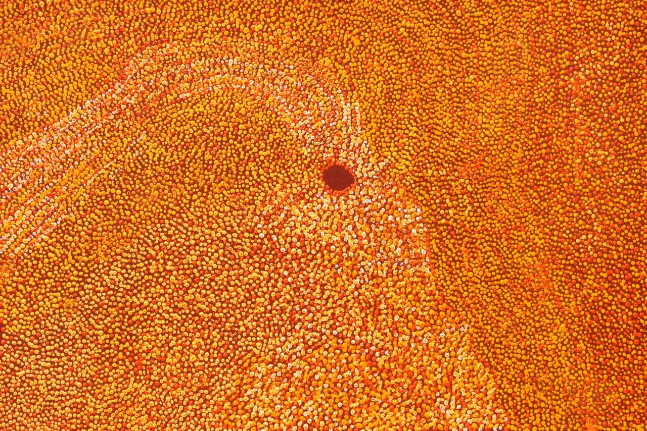Imelda has depicted her mother’s country south of Balgo, in the Great Sandy Desert. This country here is named Winpurpurla after a tjurrnu (soakwater). Winpurpurla is an inta (living water) place so it always has good water. Women travel to Winpurpurla to collect a variety of seeds including lukarrari which is ground to make damper as well as kumpupatja (bush tomato) and karnti (bush potato). Imelda is the first child born to Lucy Yukenbarri.