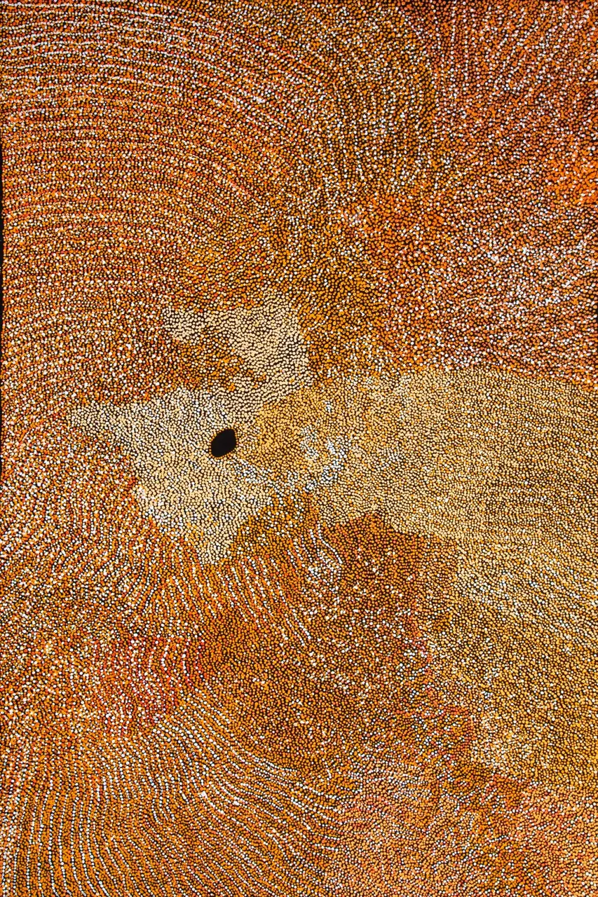 Imelda has depicted her mother’s country south of Balgo, in the Great Sandy Desert. This country here is named Winpurpurla after a tjurrnu (soakwater). Winpurpurla is an inta (living water) place so it always has good water. Women travel to Winpurpurla to collect a variety of seeds including lukarrari which is ground to make damper as well as kumpupatja (bush tomato) and karnti (bush potato). Imelda is the first child born to Lucy Yukenbarri.