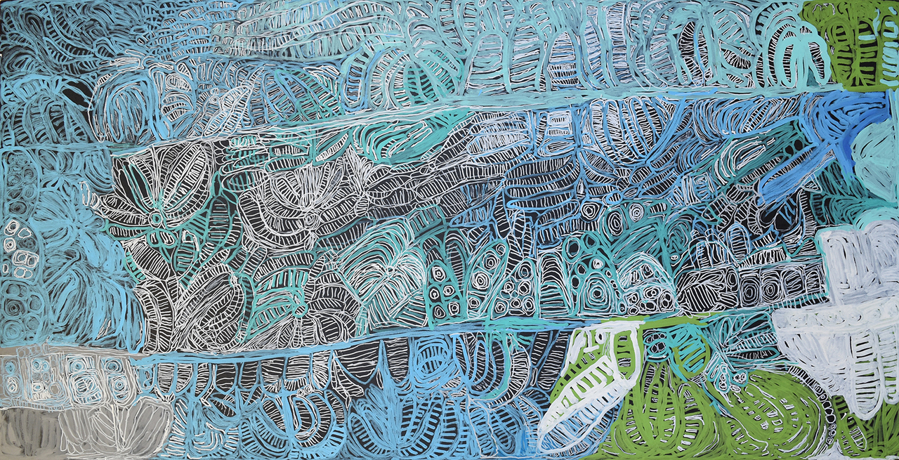 Sonia was born by a billlabong at Noonkanbah community. Her parents were Walmajarri whose movements led them to live by the Fitzroy River. Sonia has lived most her life at Noonkanbah. A compulsive artist, Sonia for a long time was a teacher’s aid at the local school where she facilitated art making with the children. Illustrative of her attachment to the country where she grew up, an intimate life with the river, Sonia’s art is a saturation of river country motifs, be it parlka (barramundi), brim, tortoise, stingray, pandanus trees or the water itself. "Martuwarra is my river country; this painting is all about the Fitzroy River which flows down through Noonkanbah where I live. All kinds of fish live in the water, we catch big mob of fish here. I like Parlka (barrumundi). We catch catfiish and brim here too. Nganku (shark), Wirritunany (swordfish) and Stingray also live here. These fish live in these waters long after the flood has gone. Also this painting is about barrumundi swimming on the surface of the water, you can also see the Wakiri (pandanus tree) and rocks all around. When the barrumundi get tired they go back into the rock holes. These rock holes hold all the Parlka (barrumundi) that live in the river. Kalpurtu (creator serpenttype being) also live in these rock holes and swim all around the Palma (creeks) and all around the Wakiri that grows in the river."