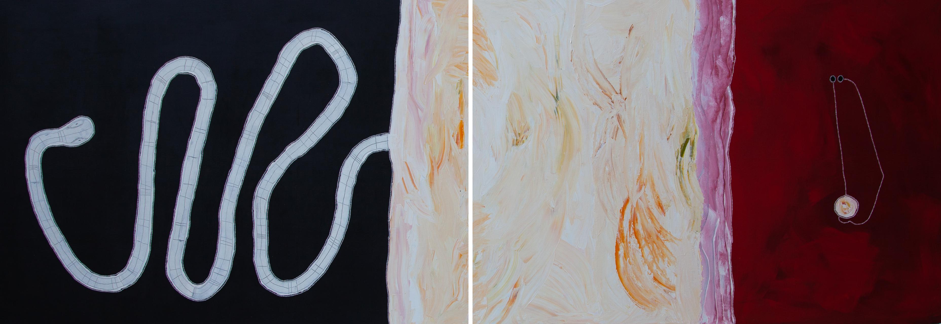 In this composition Timo has depicted the Two Men as the physical manifestation of two small grass knolls upon the lake. The two men carefully monitor the lakes expanse as the ever present Wanampi (powerful water serpent) defines the perimeter of the lake, always watching, aware of the Two Men. It is this interaction between the inhabitants of the lake that is ever present and allows Timo the creative latitude of a constantly changing landscape.