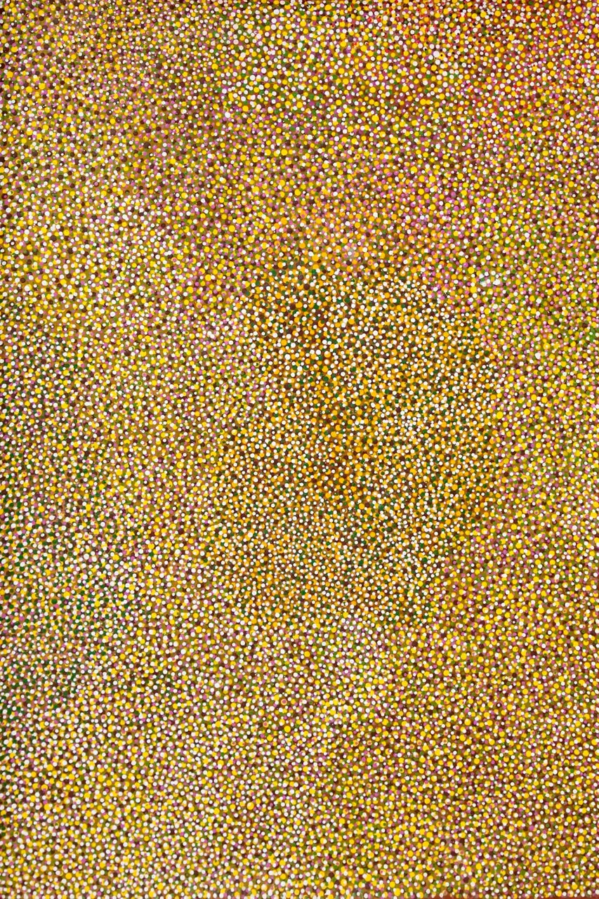 Veronica has painted some of her country near her home community of Mulan. This painting depicts Lake Gregory which has Mungul, a type of low lying creeper, surrounding the perimeter of the lake.