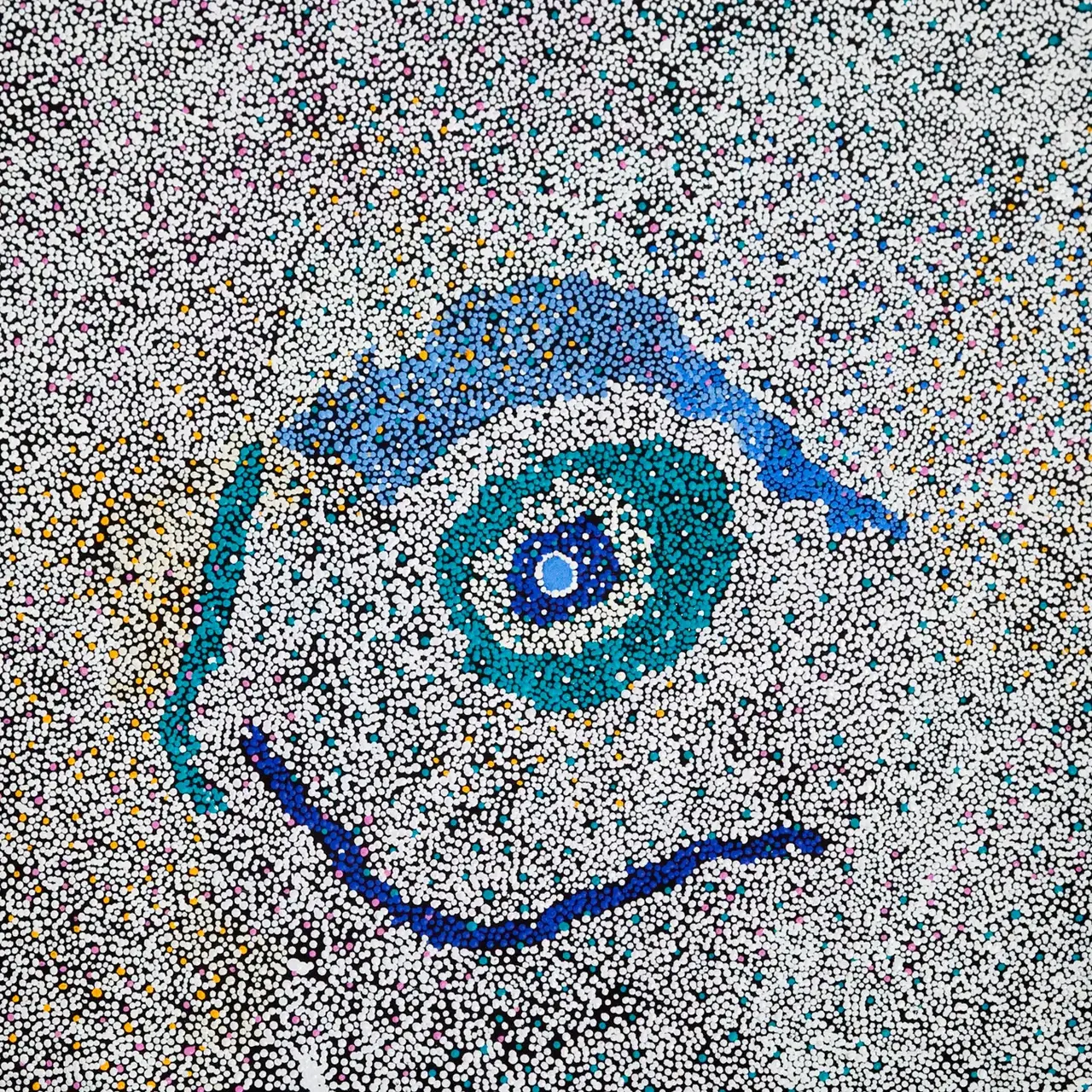 The painting depicts Tjurnu, a sacred rock hole surrounded by the different features of the country spinifex and desert trees as well as pura (bush tomatoes) and kantijilyi (raisins).