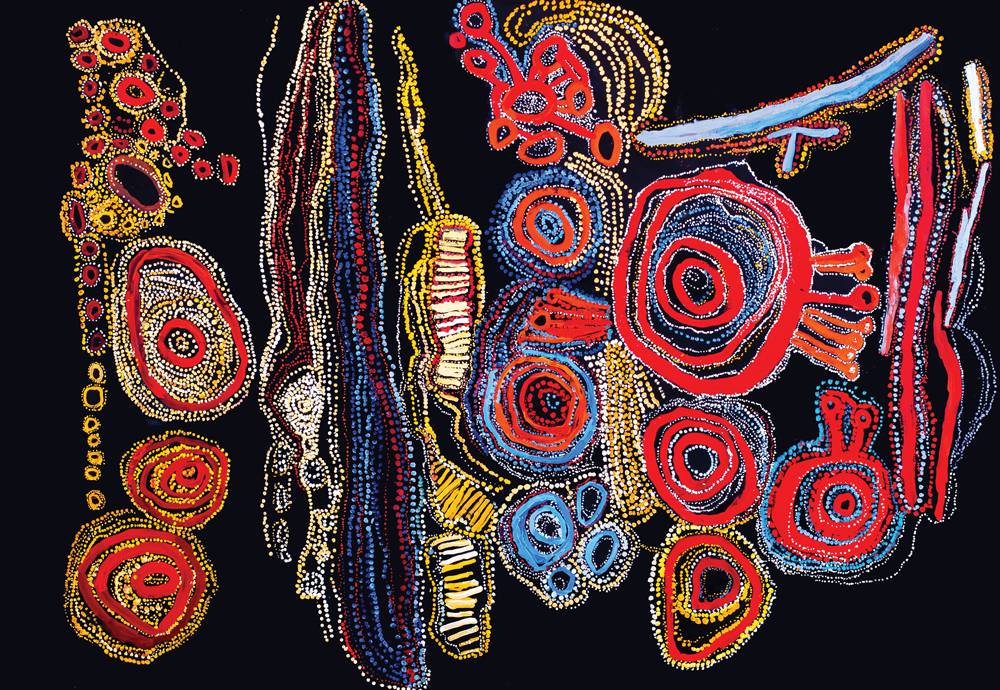 Lawrence Pennington touches the deepest qualities of the Tjukurpa in the unseen, taking the broad brush to minimal resemblance of the characters that inhabited the first journey.