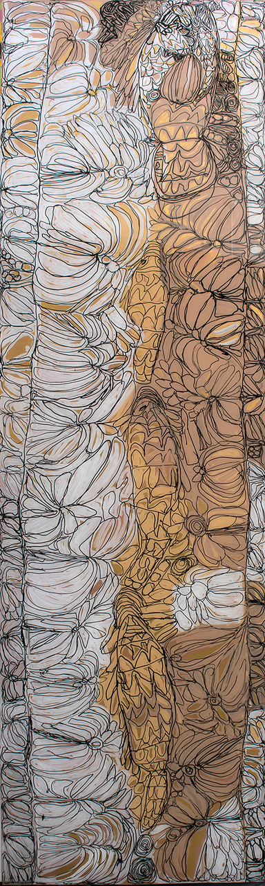 Sonia was born by a billlabong at Noonkanbah community. Her parents were Walmajarri whose movements led them to live by the Fitzroy River. Sonia has lived most her life at Noonkanbah. A compulsive artist, Sonia for a long time was a teacher’s aid at the local school where she facilitated art making with the children. Illustrative of her attachment to the country where she grew up, an intimate life with the river, Sonia’s art is a saturation of river country motifs, be it parlka (barramundi), brim, tortoise, stingray, pandanus trees or the water itself.