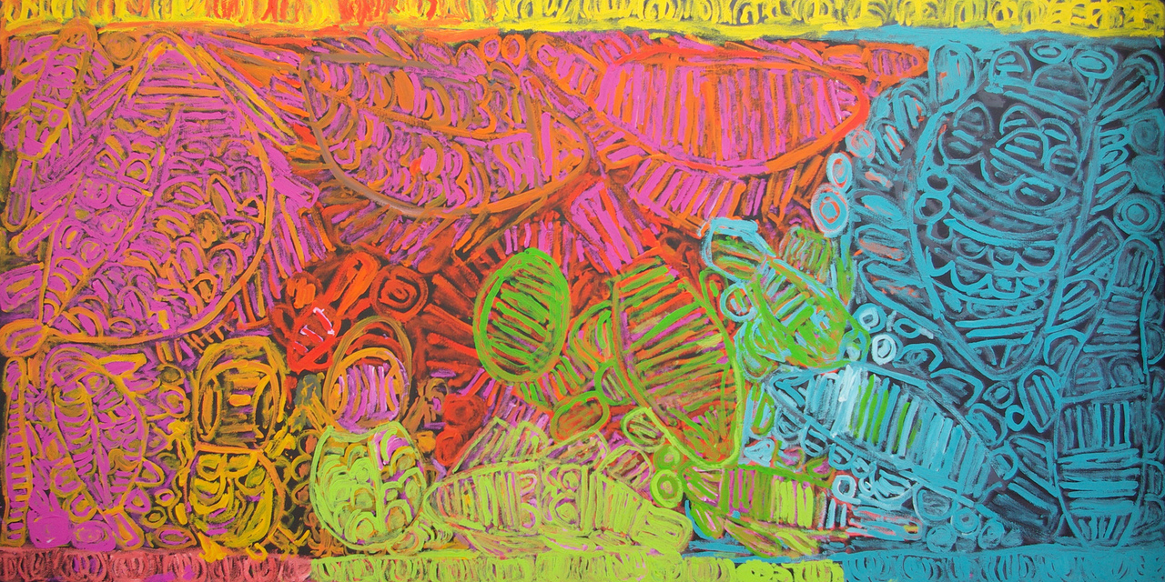 Martuwarra is my river country; this painting is all about the Fitzroy River which flows down through Noonkanbah where I live. All kinds of fish live in the water, we catch big mob of fish here. I like Parlka (barrumundi). We catch catfish and brim here too. Nganku (shark), Wirritunany (swordfish) and Stingray also live here. These fish live in these waters long after the flood has gone.