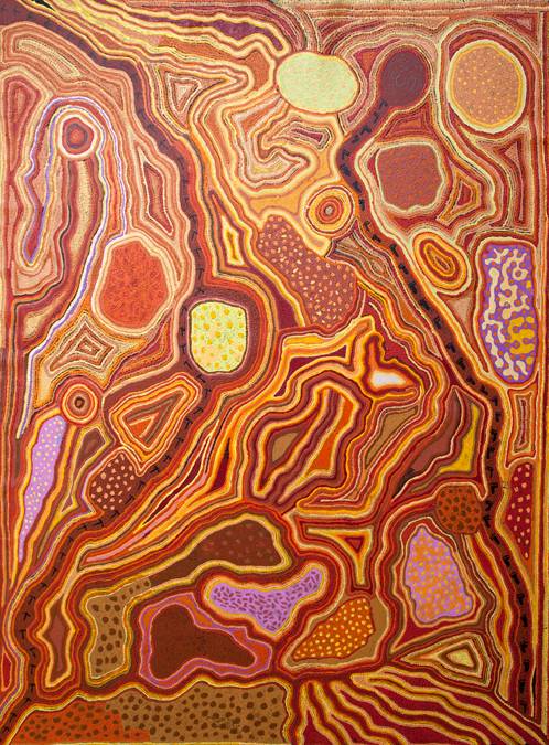 This is my country around Kanpi. This is the home and story for Malilu. She has been travelling all around collecting wild foods. She has gone into her cave, which is underground and is sitting with here wana and wira (collecting bowl and digging stick). She has all the wild foods she’s collected:; kampurarpa, kunakanti, wakati, and ngapari. Mai tjuta (lots of wild foods).