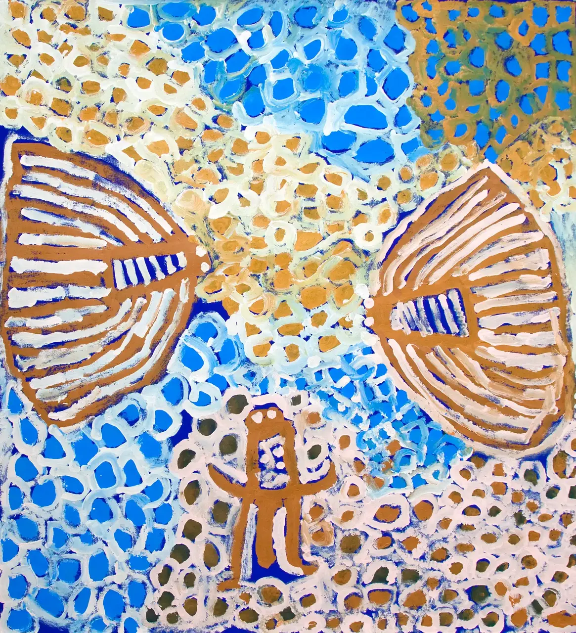 "This is a big spider man. Wati paluru Ngankari (A male healer, traditional doctor). He is a powerful man. When rain comes he hides in his nest. He is a clever man. At night time he changes colour. His name is Wanka, spider. That’s the story. Minyma wanka tjuta, these are all the women and children for this man (around him). I am the spider man, ngankari (healer, traditional doctor).