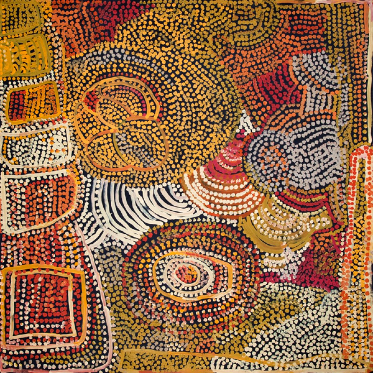 This painting is about Milatjari’s home, family and culture. The country is Antara, a is a place not far from Mimili Community. Antara country belonged to Milatjari’s uncle. Milatjari’s mother and father would take her sister and brother out hunting and gathering for food from Antara. Milatjari’s father would hunt for kangaroos and goannas; while her mother would take the children to gather bush tucker.
