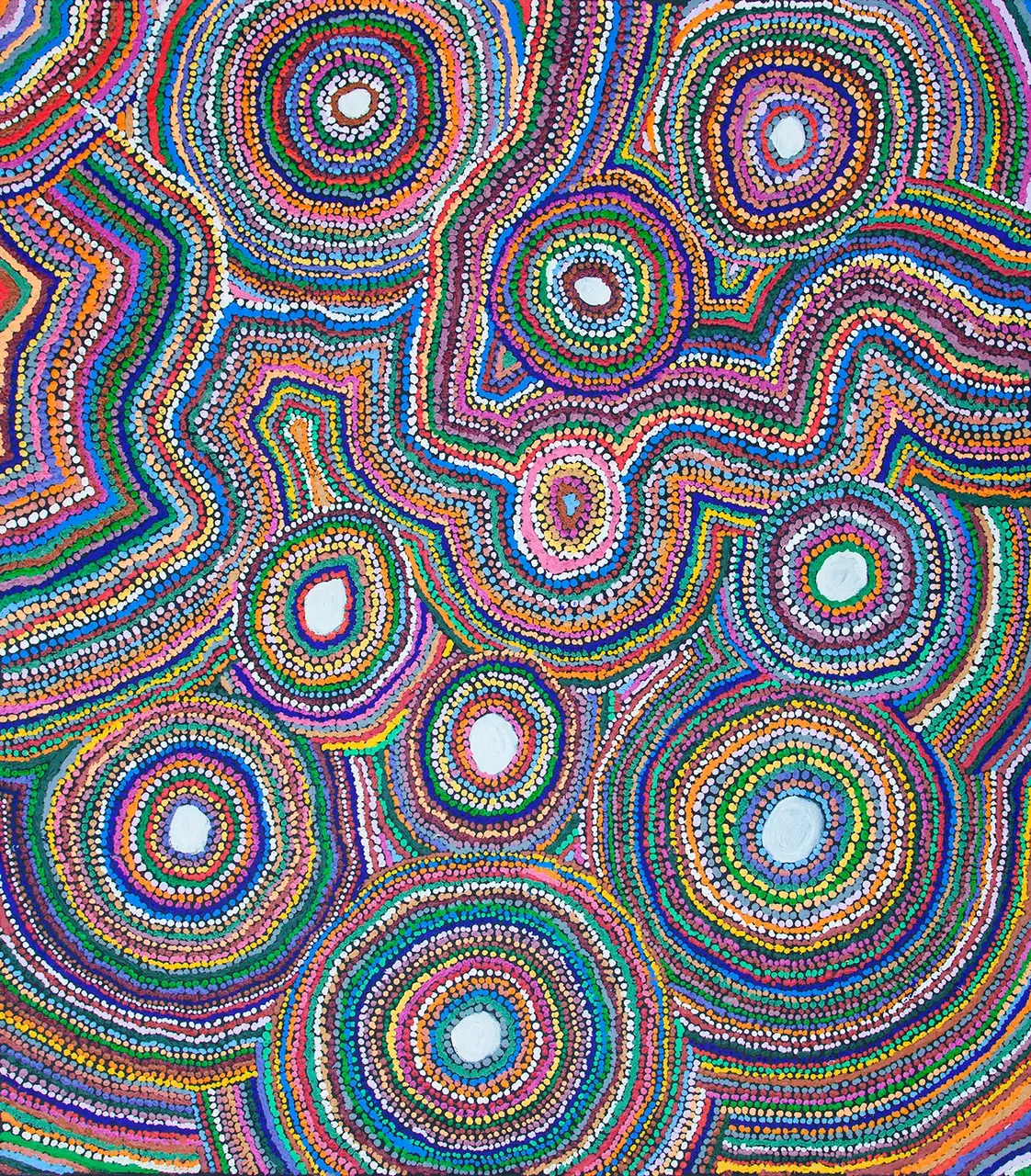 Ngayuku Ngura means ‘My Place’. Samuel Miller paints traditional iconography of his land, east of Kalka. Rockholes, creeks and hills feature in his paintings, all immersed in Tjukurpa (Dreaming stories). His land is a sacred men’s rockhole and the name is not allowed to be written down. His colour palette is drawn from the varying colours in the landscape surrounding Kalka and Pipalyatjara, and used in a rainbow-like patterning in his work.