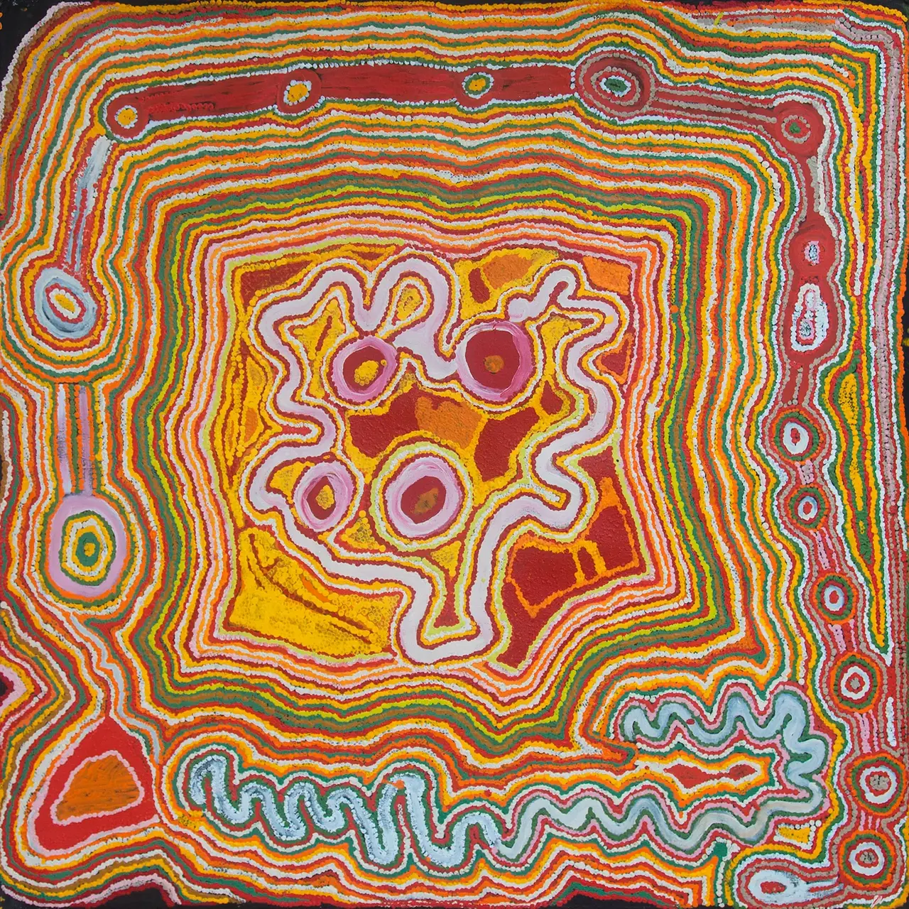 One day when they were sleeping, they were awoken by a loud buzzing sound. The Minyma Punpunpa (the female flies) had been attracted to the honey grevillea plants found near the waterhole and were making lots of noise as they buzz around the honey bush. It prompted the father and son to get up and collect honey from the plants. While they were collecting, the Wati Mututa (male black ants) appeared and speared the son in his side. The young son started spitting and spits out the yellow and orange seeds of all the different varieties of honey grevillea plants that are still found at the site today. They include Kaliny-kalinypa, Ultunkunpa, Piruwa and Witjinti.