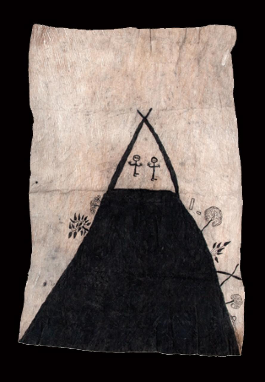 Created by senior Ömie tribeswomen, the nyog’e are the outcome of a long period of apprenticeship. Females within their respective marital and birth clans learn the techniques and customs which lead to the production of these beautifully crafted, spiritually routed artworks. The practice of making barkcloths originated from the time of the ancestors. Their creation story tells of how Mina, the first man, instructed Suja, the first woman, to beat and dye the first barkcloth. For centuries Ömie women have been painting designs onto barkcloth, however, many of the designs are also derived from the ujawe, the somewhat painful Ömie initiation rite involving the tattooing of clan insignia onto skin. Contact with Christian missionaries in the mid twentieth century heralded a cultural shift in Ömie practices, and contributed to the transference of these designs from the skin and onto the barkcloth. Now, particularly when worn as clothing, the nyog’e forms a sort of ‘double skin’, which constitutes something of an artistic armoury for the retention of traditional Ömie knowledge and cultural practice.