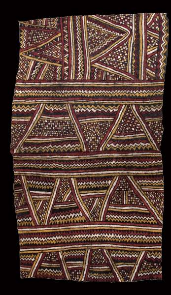 The lines running directly through the work are known as orriseegé or ’pathways’ and provide a compositional framework for the design. The large zig-zagging lines are dahoru’e - Ömie mountains. The rows of small black triangles like sawtooths at their edges are also dahoru’e but the small zig-zags directly above them are buboriano’e - beaks of Blyth’s Hornbill (Rhyticeros plicatus). The cross-hatch design is tuböru unö’e - the design of the egg of the Dwarf Cassowary (Casuarius bennetti). Cassowary eggs are an important seasonal food source for Ömie people.