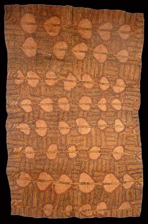 Linda-Grace has painted soru’e - Ömie tattoo designs taught to her by her mother-in-law Fate Savari. The eight strings that run through the work have both mahudan’e and mahu ane bios’e (large and small pig’s tusks) attached which is the traditional wealth of Ömie people. The strings are also sprouting hin’e baje, fruit of the mustard plant, which is used to dip into the lime gourd as well as to aid in the chewing of betelnut, a very important Ömie social custom known as hai’ue. Between the strings and around the edges of the work are repetitious lines representing nyoni hano’e (fern leaves).