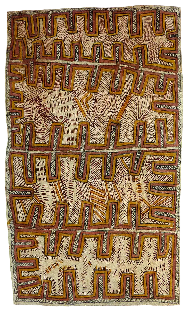 This work is composed purely of ujawé soru’e (tattoo designs) that adorned the body of Sarah Ugibari’s late husband, a man from Gora village. This tattoo design is taken from the chin and is believed to represent the pattern of tree bark seen on the trunk of a tree in the time of the Ancestors. This is the only example Sarah painted of this particular design during her time painting for Ömie Artists (2009 – 2015). Jö’o sor’e, the design of the uncurling fern frond, can also be seen.