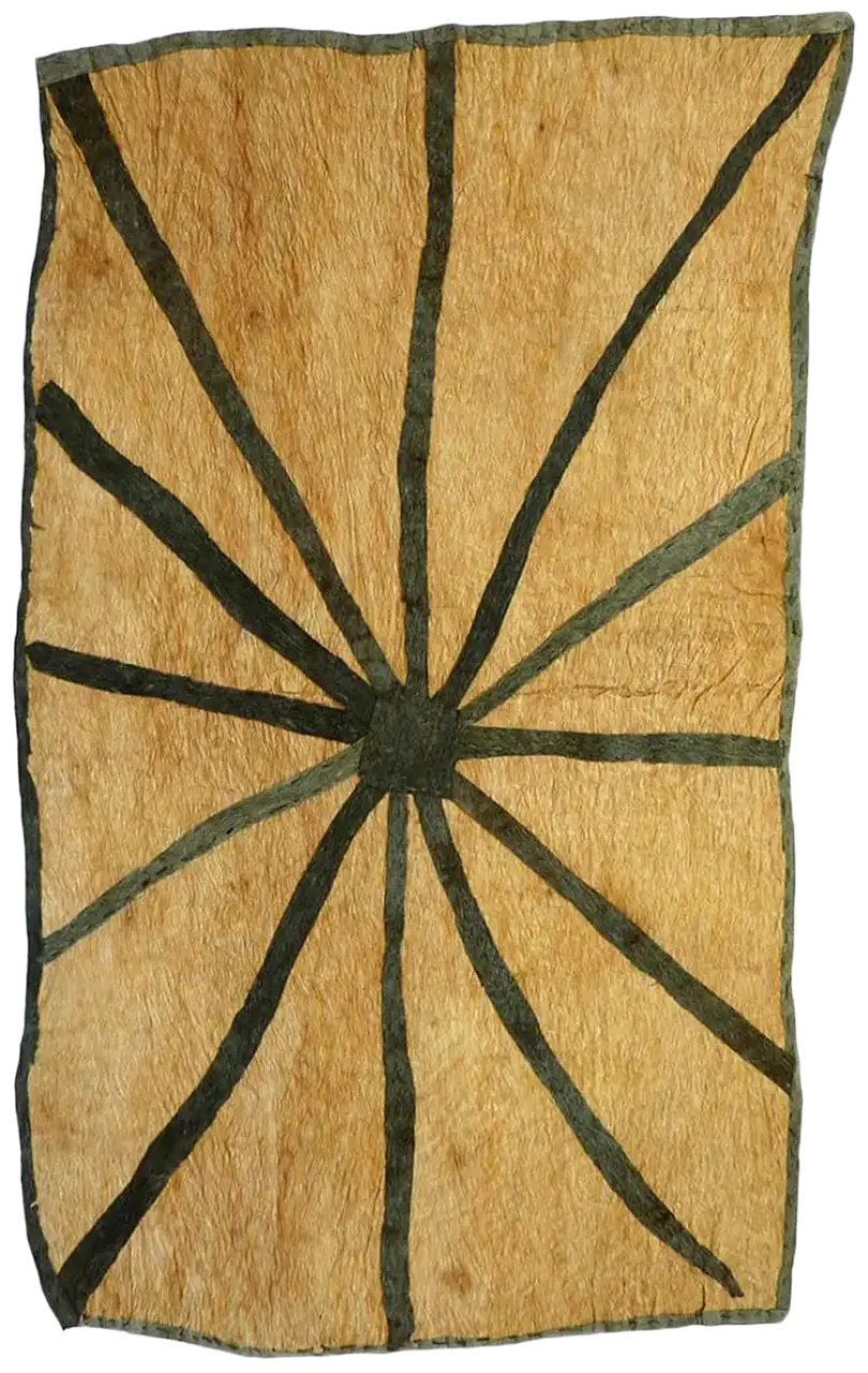 Brenda Kesi (Ariré) has created an ancestral sihoti’e taliobamë’e (design of the mud) known as wo’ohohe and representing the ground-burrowing spider, just as she was taught by her mother, Go’ovino. This design can be traced to the the old Ematé clan village of Enopé which was abandoned due to the 1951 eruption of Huvaimo (Mount Lamington). Brenda recalls how, before that, her mother was taught this design by her mother, Munne. She explains how in the old days of making barkcloths the women had no paints so they would soak the barkcloth in mud, cut the desired pieces and then sew them onto the plain barkcloth. The contrasting effects would result in various bold visual designs. The design was sewn with a bat-wing bone needle and a river reed was shredded to create the sewing thread.