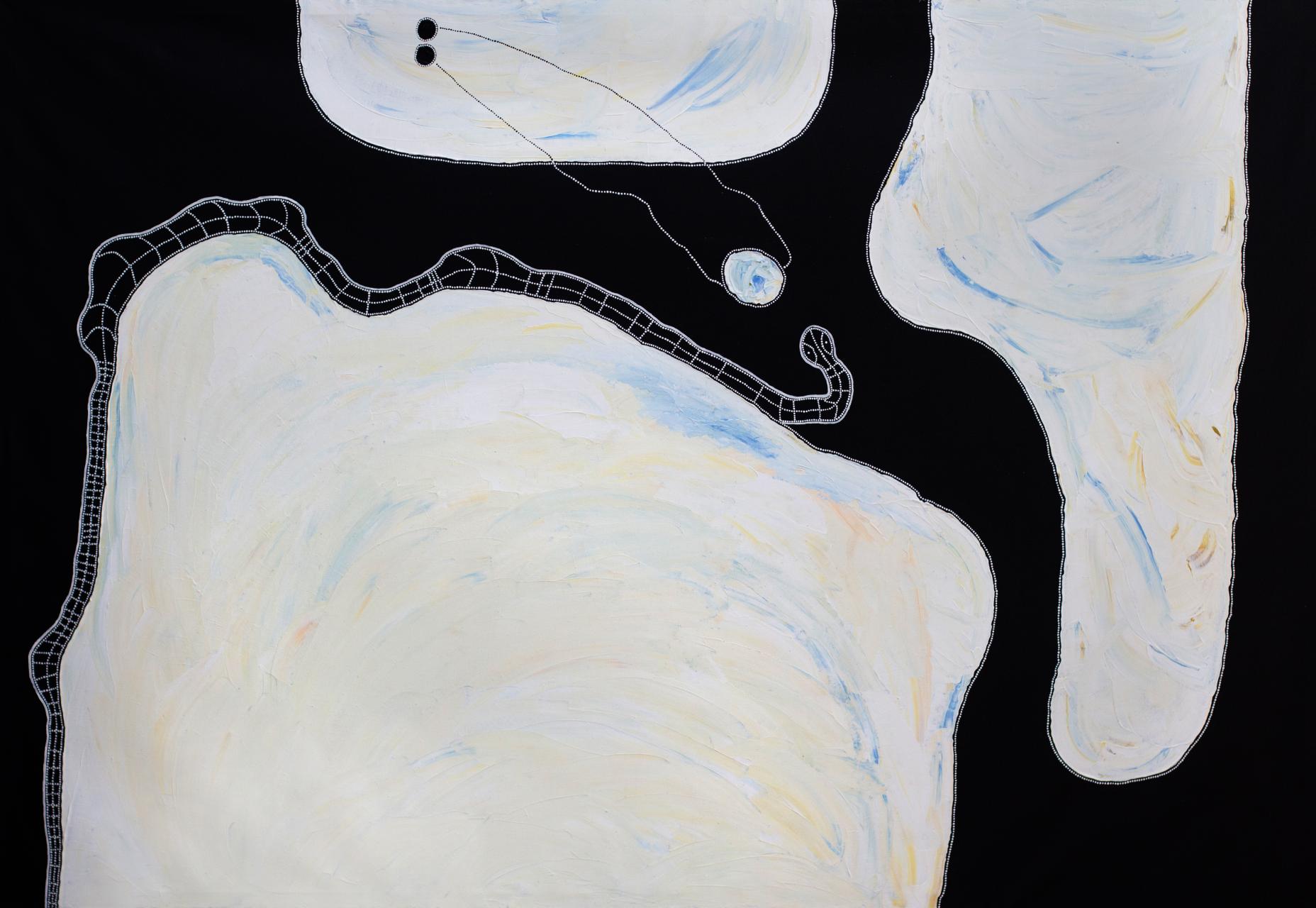 Lennard also paints the Wati Kutjara Tjukurpa of Pukara, a story depicting two snakes, a father and son who are travelling across country during ceremonial time. Along with the Kungkarangkalpa Tjukurpa the Wati Kutjara story is one of the most important and wide ranging stories in Spinifex country. Although much of the specific detail is dangerous and secret the general actions and directions of the father and son are well known and understood to have been essential to the formation and activation of much of the country.