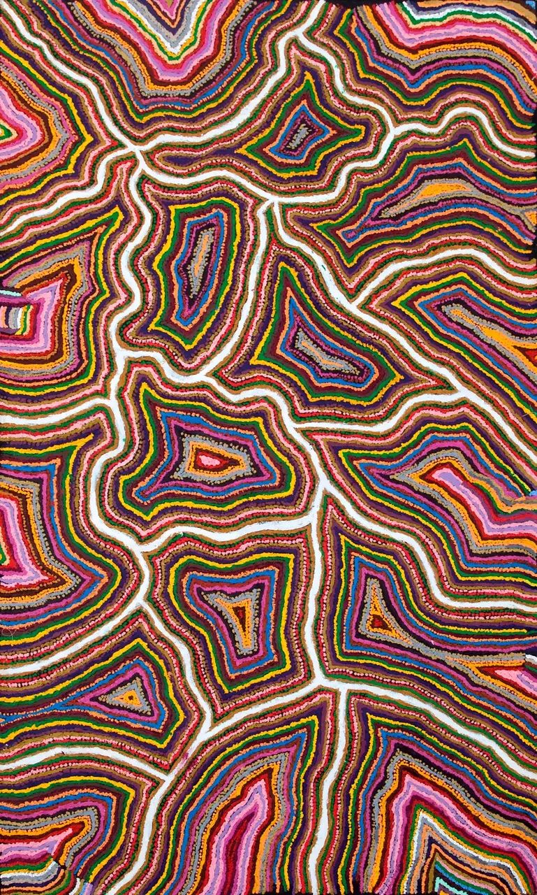 Ngayuku Ngura means ‘My Place’. Samuel uses an extensive palette of colours to paint the country surrounding Kalka and Pipalyatjara. His paintings feature the various land formations from that area - rockholes, creeks and hills. His land is a sacred men’s rockhole, so sacred that the name is not allowed to be written down or spoken about.