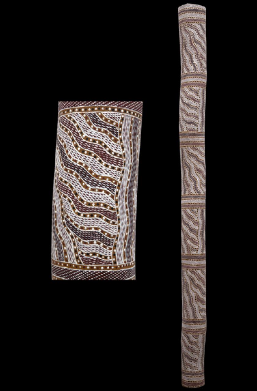 Barayuwa has done his mother’s Munyuku clan’s design, inspired by the late ritual specialist and artist Dula Ngurruwutthun. It is associated with the ancestral events relating to the death of the ancestral whale called Mirinyungu on the beaches of the Munyuku saltwater estate of Yarrinya within Blue Mud Bay. In ancestral times, a whale called Mirinyungu was living in the ocean at Yarrinya. The whale, being Munyuku, was in its own country. Munyuku spirit men called Wurramala or Matjitji...