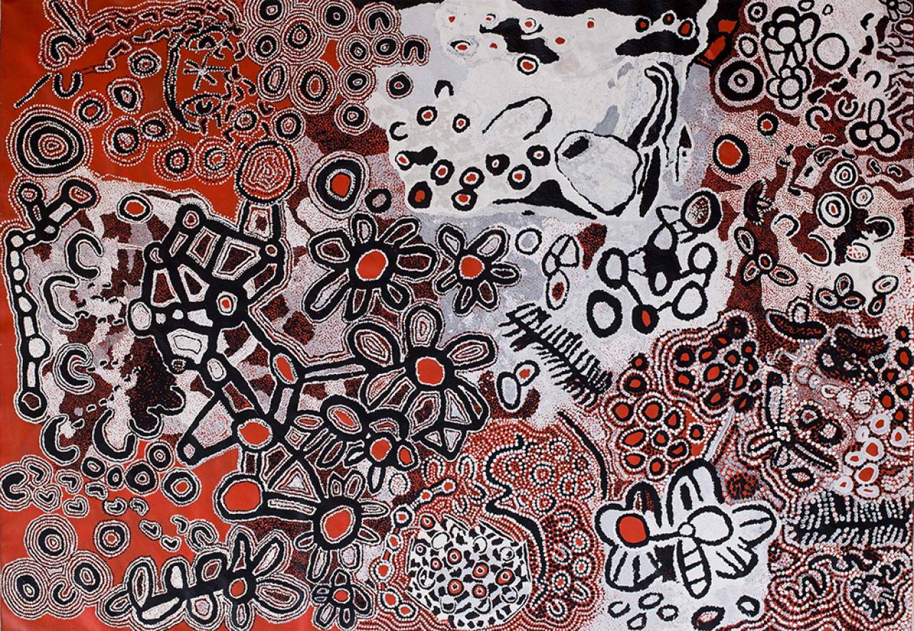 Ten Spinifex women, Tjaruwa Woods, Myrtle Pennington, Kanta Donnegan, Maureen Donnegan, Marilyn Walker, Betty Kennedy, Shonna Jaimeson, Ivy Laidlaw, Estelle Hogan and Ngalpingka Simms have collaborated in this major painting depicting Kungkarangkalpa Tjukurpa (Seven Sisters Creation Songline).