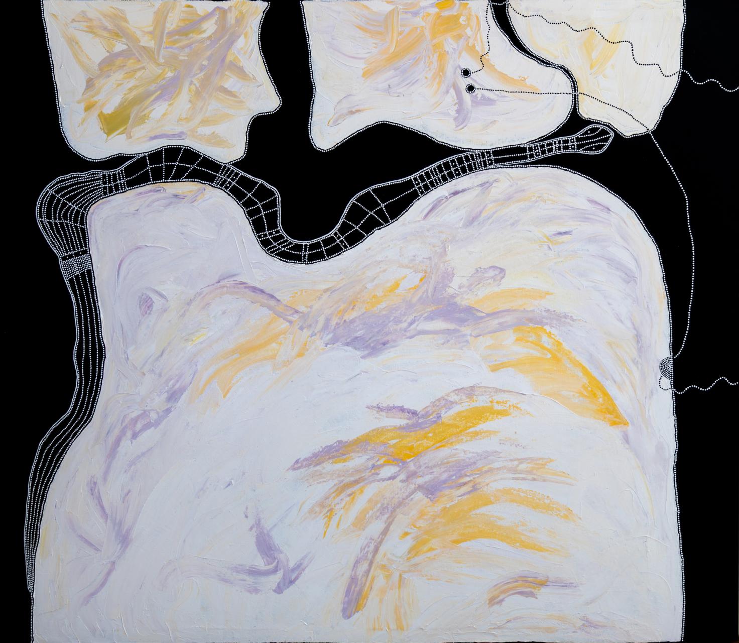 In this composition Timo has depicted the Two Men as the physical manifestation of two small grass knolls upon the lake. The two men carefully monitor the lakes expanse as the ever present Wanampi (powerful water serpent) defines the perimeter of the lake, always watching, aware of the Two Men. It is this interaction between the inhabitants of the lake that is ever present and allows Timo the creative latitude of a constantly changing landscape.