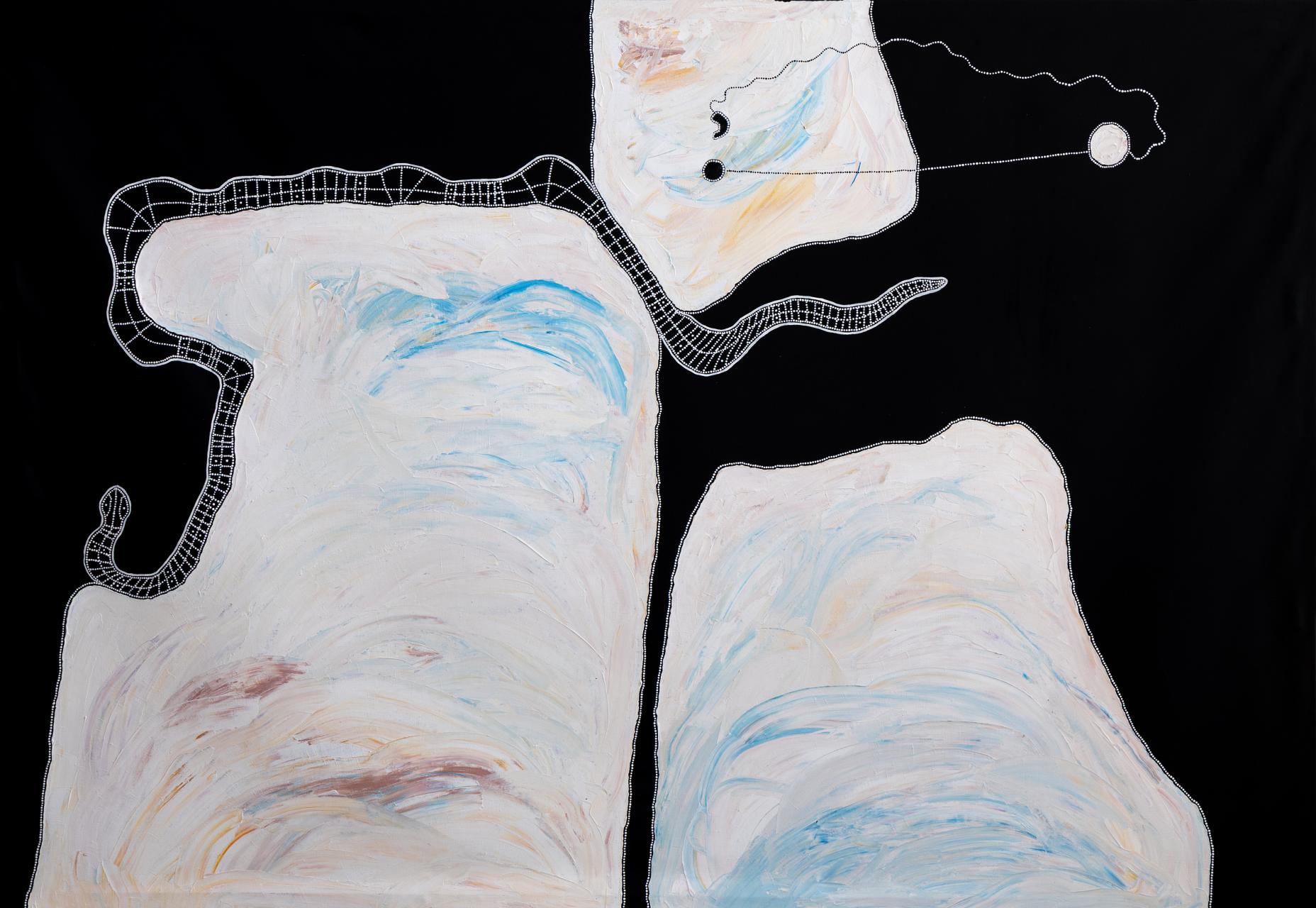 In this composition Timo has depicted the Two Men — Wati Tinka (Sand Goanna Man) and Wati Mulya Maru (Black Nosed Monitor Lizard Man) — as the physical manifestation of two small grass knolls upon the lake. Wati Tinka is depicted as the crescent form with his tracks defined by the movement of his long tail. The two men carefully monitor the lakes expanse as the ever present Wanampi (powerful water serpent) defines the perimeter of the lake, always watching, aware of the Two Men. It is this interaction between the inhabitants of the lake that is ever present and allows Timo the creative latitude of a constantly changing landscape. These characters that Timo talks of are the Creation beings.