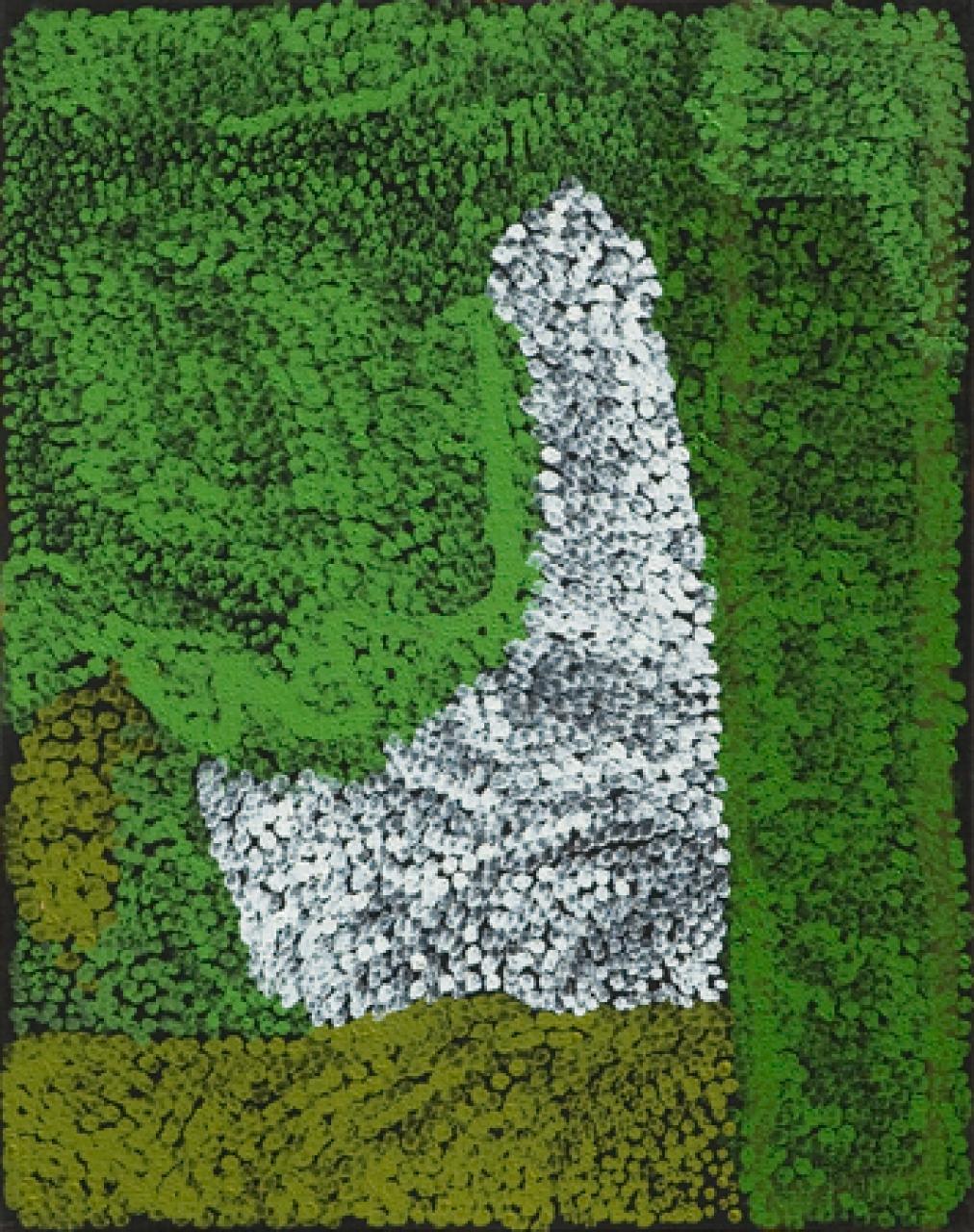 Lydia says "I be born this country. It woman’s country this side of Winpa. We go hunting follow king brown tracks. see that baby snake and the egg. that baby snake he go to rockhole he live there." The underpainting lines shows the king brown snake and its tracks.