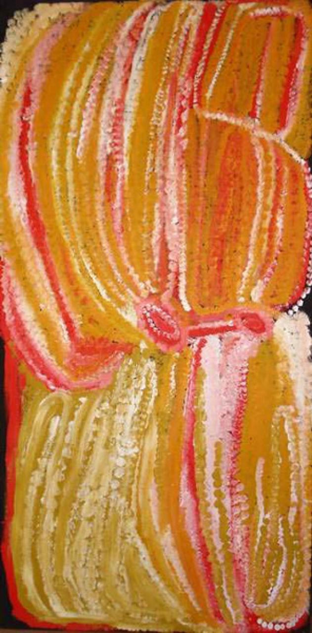 Eubena has painted some of her country south west of Balgo along the middle stretches of the Canning Stock Route. The majority of the painting shows the tali (sandhills) that dominate this country.