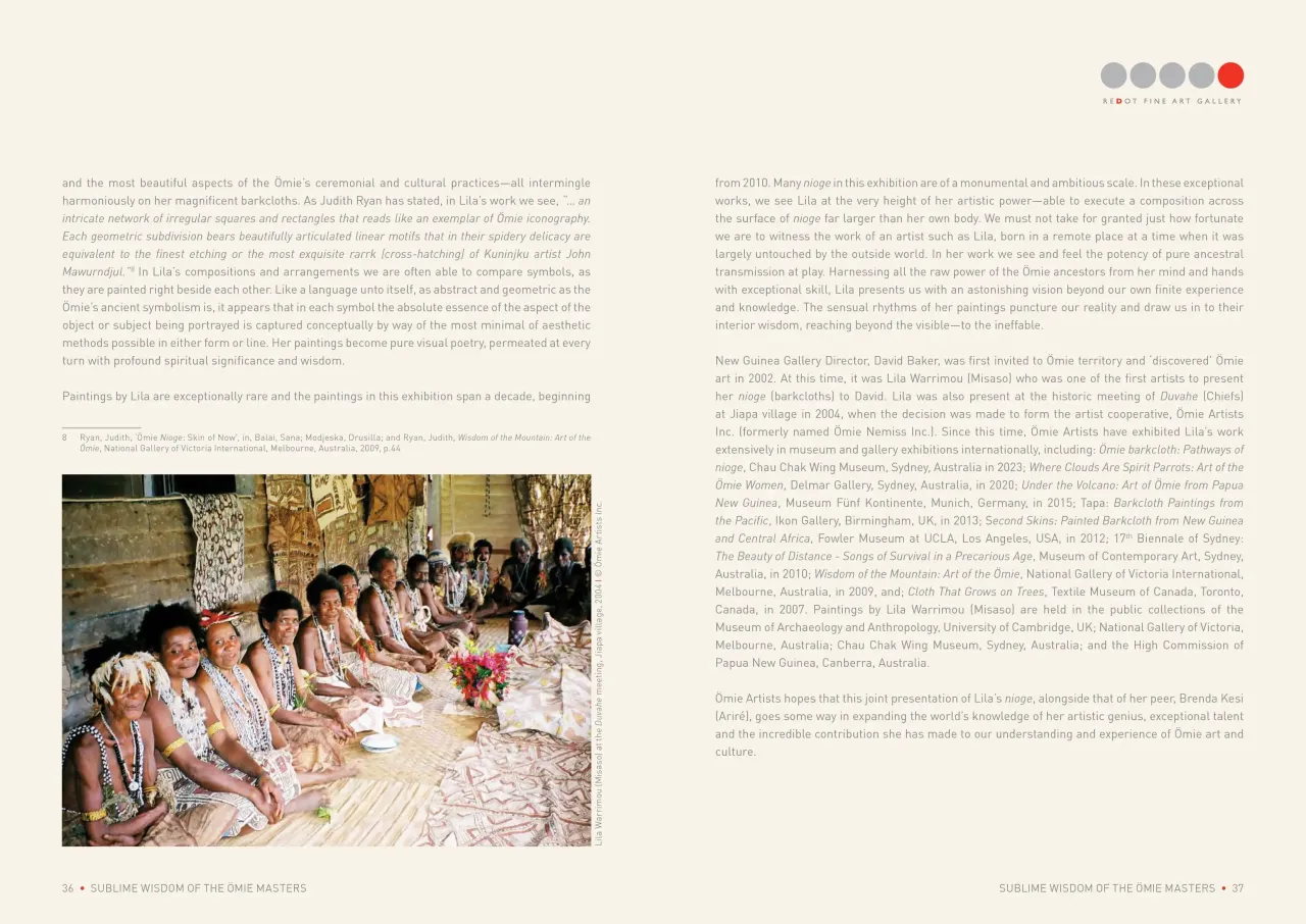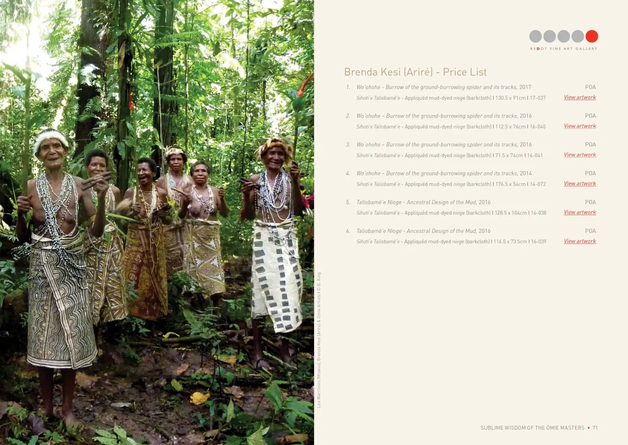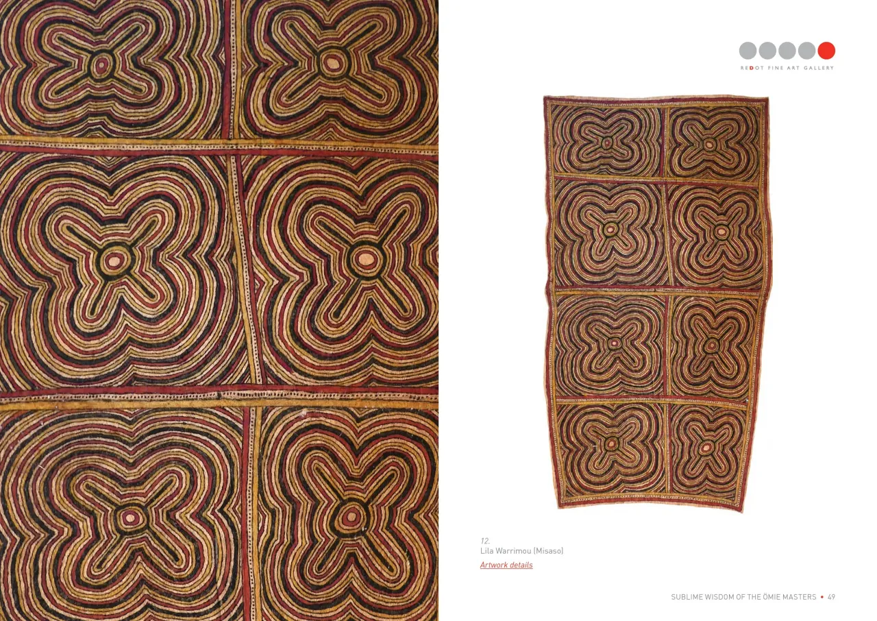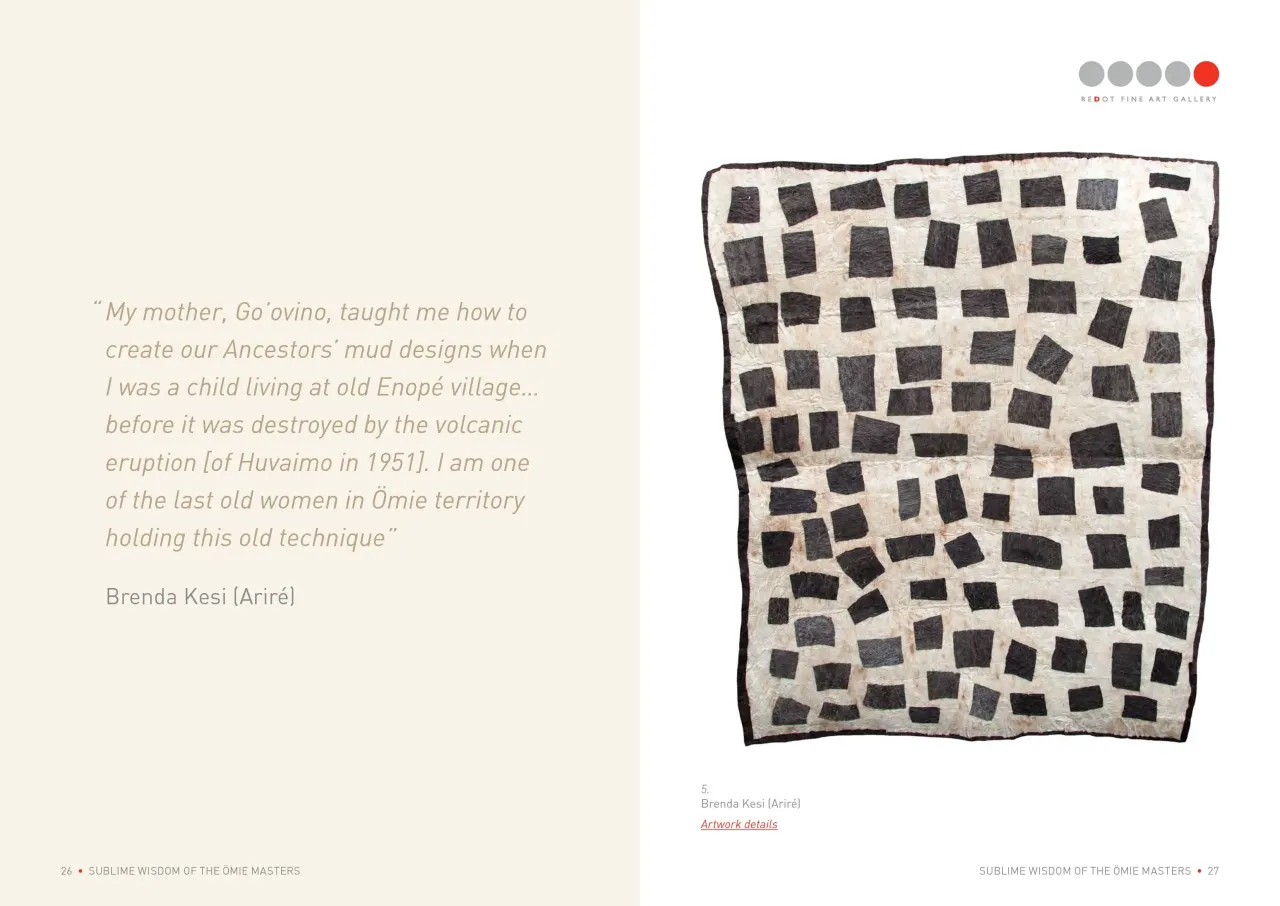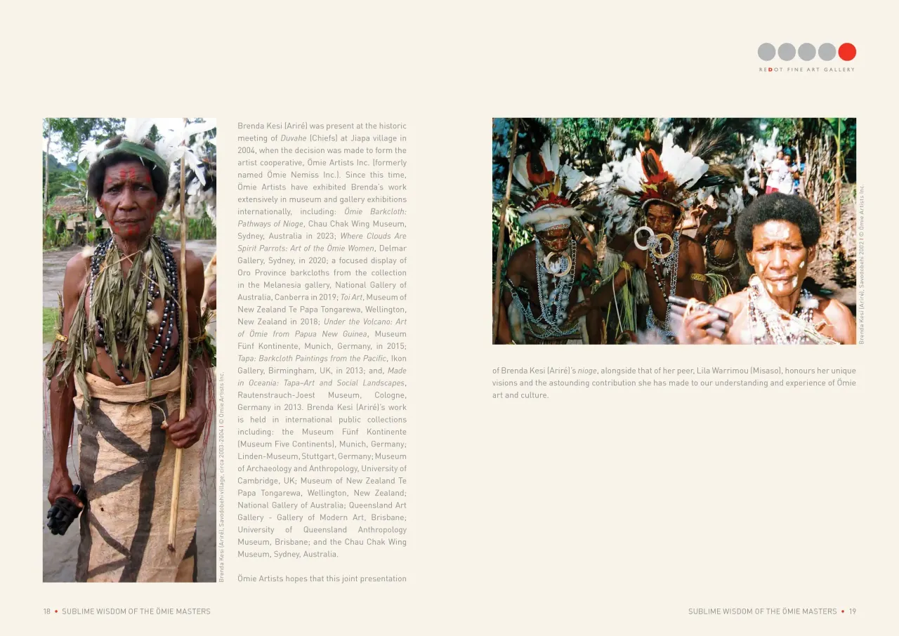 ReDot Fine Art Gallery is honoured to present our latest exhibition, ‘Sublime Wisdom of the Ömie Masters: The Final Release of Works by Brenda Kesi (Ariré) & Lila Warrimou (Misaso)’. This exhibition follows on from the momentous show, ‘The Art of Isawdi (Fate Savari)’, which we presented in 2021/2022, in Singapore and then to critical acclaim at Delmar Gallery in Sydney. This new exhibition features six rare and previously unreleased mud-dyed barkcloth works by Brenda Kesi (Ariré) [born circa 1937], along with twelve similarly unseen, barkcloth works by Lila Warrimou (Misaso) [born circa 1944], who is the Paramount Chief of Ömie women.