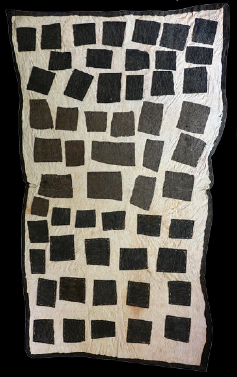 Brenda has created an ancestral sihoti’e taliobamë’e (design of the mud) as she was taught by her mother, Go’ovino, when she lived at the old Ematé clan village Enopé before the 1951 eruption of Huvaimo (Mount Lamington). Brenda recalls how, before that, her mother was taught this design by her mother, Munne. These square designs are known as taliobamë’e. She explains how in the old days of making barkcloths the women had no paints so they would soak the barkcloth in mud, cut the desired pieces and then sew them onto the plain barkcloth. The contrasting effects would result in various bold visual designs. The design was sewn with a bat-wing bone needle and a river reed was shredded to create the sewing thread.