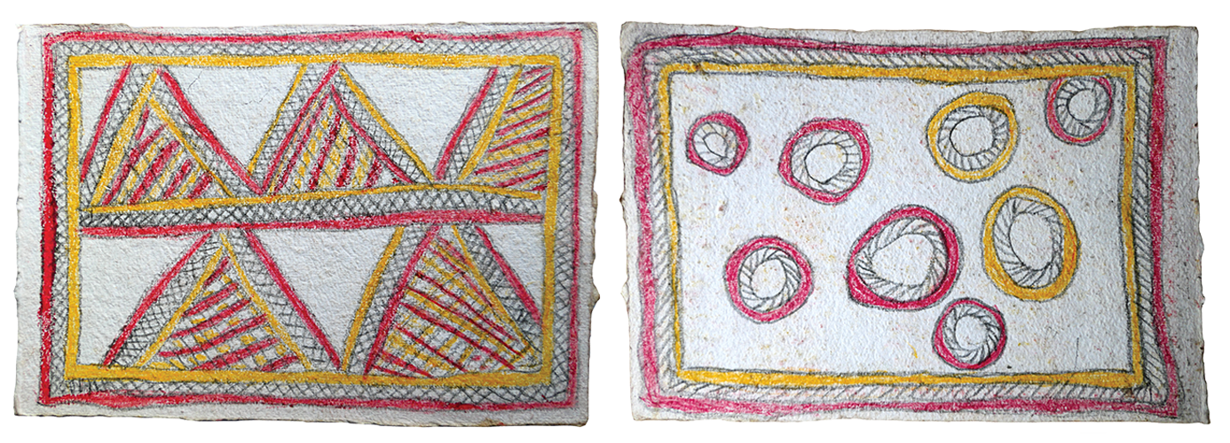 In 2012 at Gora Art Centre, Fate Savari presented a schoolbook she had obtained from her granddaughter. It was filled from front to back with drawings about her ancestral Ömie stories (including the creation story), histories, culture and clan designs. There were also some loose pages in the front and back of the schoolbook and more drawings on paper wrapped up in a larger drawing on paper. Fate created the book and drawings because she felt a great urgency to record her profound knowledge before she passed away. She used whatever materials she could find on hand. After presenting this first book, Fate requested “another book and drawing materials” so she could still create art during the seasons that she didn’t have any barkcloth to paint. So in 2014, Fate filled yet another drawing book with her art and this drawing is from that second collection of drawings.