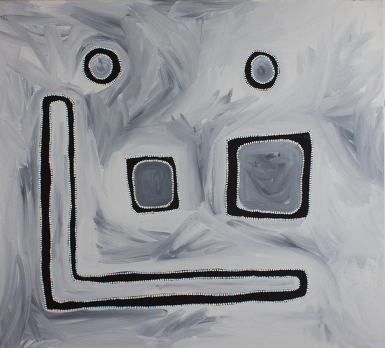 That man looking down from the top of the painting (represented by the black shape) said “I’ll go down to the water.” The man at the bottom (of the painting) said “I’ll go up there to the water.” Those (shapes) represent two men talking together. They told each other “A mob of people are coming here to us from the east. This one is going too. Let’s all meet up there. There at the water hole we can get crocodile, turtles and water goanna.”