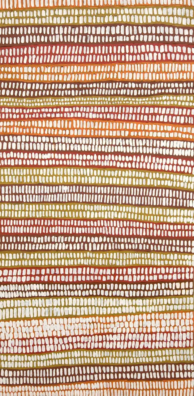 Morris has painted the country far to the south of Balgo near Wilkinkarra (Lake McKay). This is Morris’ father’s country. The majority of the painting shows the travels of a group of Tingari men as they journeyed to Wilkinkarra. The square shapes indicate the tali (sandhills) and the central circle is a warniri (rockhole) where the men camped.