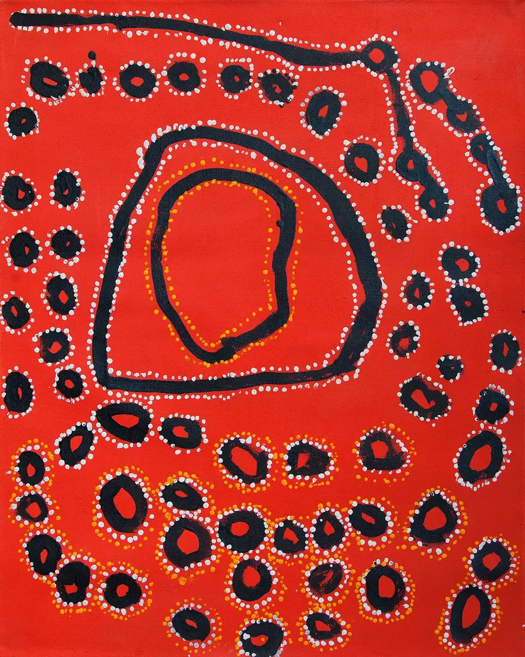This painting is depicting Mituna. The Two Men who were travelling from Pukara to Mituna stopped and made camp at the different places along the way. When they stopped and made camp at Mituna, the son waited until the middle of the night, then arose and ran off looking for trouble.