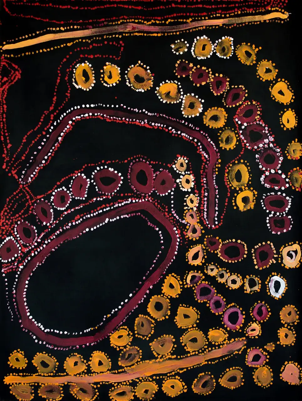 Being a major sacred site, much of the detail placed into the work is miil-miilpa (dangerously sacred) and cannot be elaborated. In documenting a work such as this, Lawrence will identify the major sites shown, leaving the knowledge about what is at, or passes through that site, known only to those who have the status to already know.