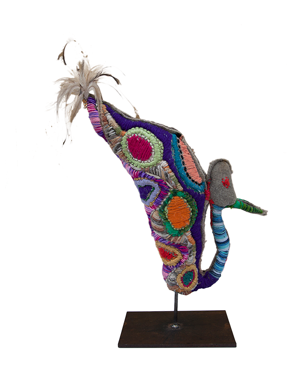 This is a soft sculpture made with recycled woollen blankets. The blankets are dyed using local Arrernte plants and rusty bits of metal. The blankets are then used as the base material for the sculpture.