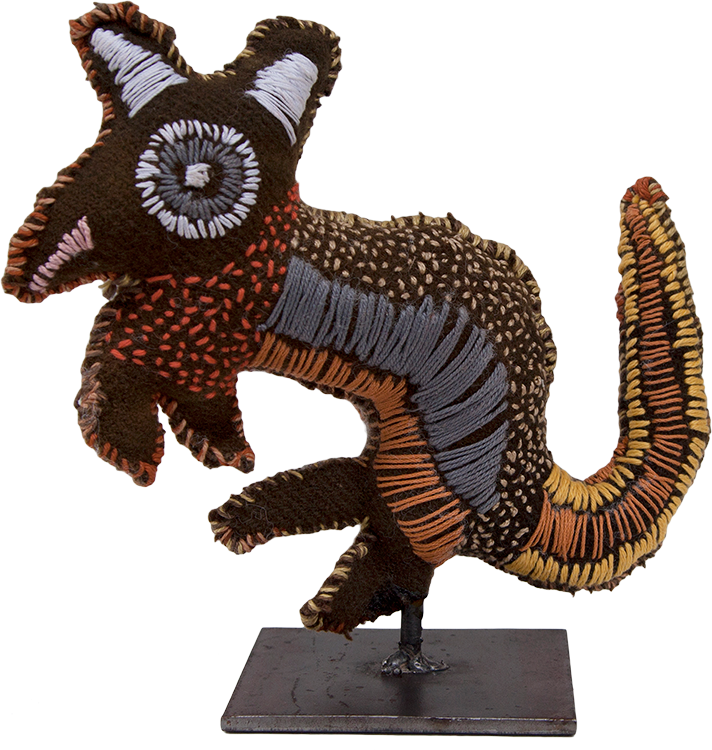 This is a soft sculpture made with recycled woollen blankets. The blankets are dyed using local Arrernte plants and rusty bits of metal. The blankets are then used as the base material for the sculpture.